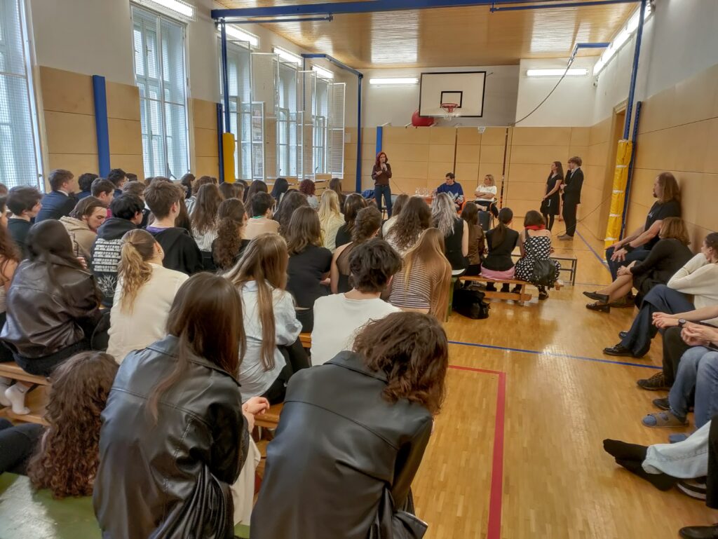Následující pondělí pak na naši školu zavítal Tomáš Koblížek z Filozofického ústavu AV ČR, autor knihy Dezinformace a hate speech: Z hlediska filozofie, práva a bezpečnosti (Academia, 2025). Studenti a studentky VI.A a 2.D díky tomu mohli vyslechnout přednášku o tom, co vlastně spojení „hate speech“ znamená, a sledovali analýzy některých příkladů tohoto jevu z ne úplně vzdálené historie i ze současnosti. V závěru proběhla krátká debata. Tomáši Koblížkovi rovněž moc děkujeme!